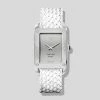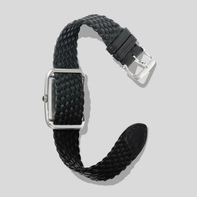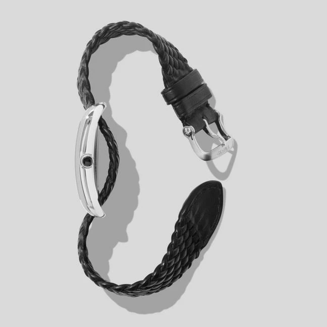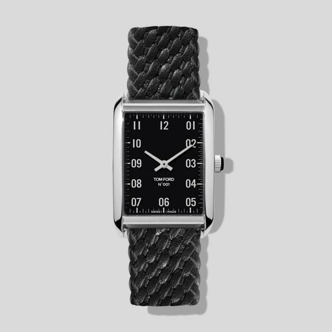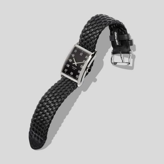 Tom Ford 001, large, quartz movement. Polished stainless steel case and crown with onyx inlay. Glossy black dial, diamond cut hands painted white, sapphire crystal. Black Braided Calf leather Interchangeable strap. Case dimensions: 30mmx44mm. Water-resistant to 3 ATM. Swiss made.