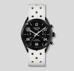 Tom Ford 002 Limited Edition, automatic chronograph movement. Case made of titanium with brushed finish and black DLC coating. Polished titanium crown black DLC with black onyx insert. Exhibition caseback with TOM FORD signature etched in the sapphire glass. Limited to 150 pcs with each piece numbered on caseback. Matte black dial with label and printed glossy white numerals, round cut white Super luminova painted hands, sapphire crystal with anti-reflective coating. Case dimensions: 43.5mm round. Water-resistant to 3 ATM. Perforated racing strap in black calf leather with titanium buckle brushed finish and black DLC coating. Limited Edition packaging with titanium color paper outer box. Swiss made.
