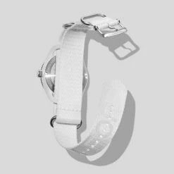 Tom Ford 002, large, automatic movement. Case with rotating topring made from 100% ocean plastic with brushed stainless steel caseback, brushed stainless steel screw down crown with ocean plastic inlay. Matte white dial with glossy black numerals, diamond cut black painted hands white Super luminova , sapphire crystal with anti-reflective coating on top. Case dimensions: 43mm round. Water-resistant to 10 ATM. TOM FORD jacquard white strap made from 100% ocean plastic with brushed stainless steel buckle and loops. Recyclable packaging made from 100% ocean plastic, recycled paper box and interior. Swiss made.