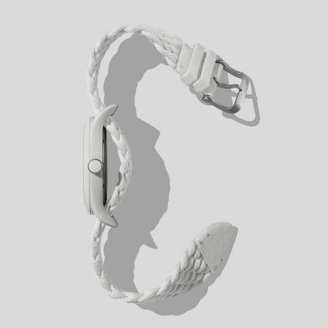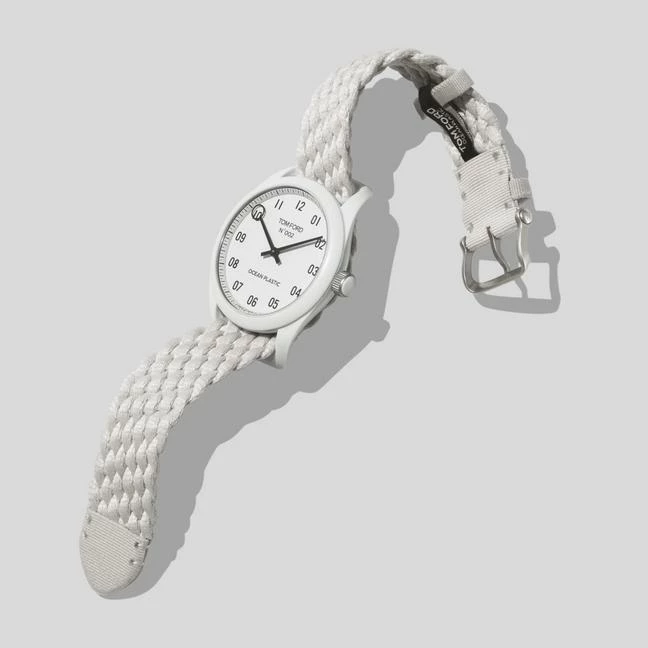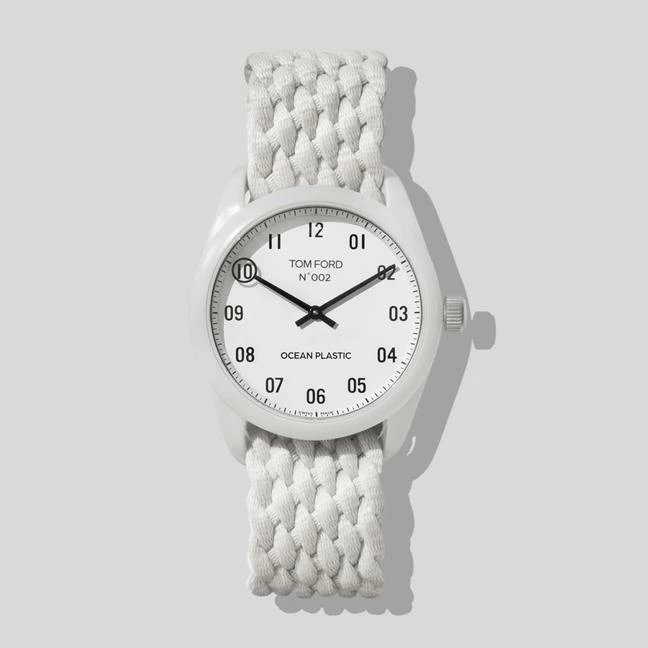 Tom Ford 002, large, quartz movement. Case made from 100% ocean plastic with stainless steel caseback in matte finish, matte stainless steel crown with ocean plastic inlay. Matte white dial with black printed numerals, diamond cut black painted hands, sapphire crystal with anti-reflective coating on top. Case dimensions: 40mm round. Water-resistant to 10 ATM. TF signature braid white strap engineered and woven out of 100% ocean plastic with matte stainless steel buckle. Recyclable packaging made from 100% ocean plastic, recycled paper box and interior. Swiss made.