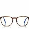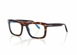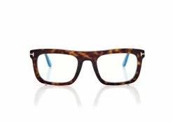 Discover the latest ready-to-wear clear lenses now available in TOM FORD Eyewear. These protective lenses reduce risks of blue lights and increase visual comfort from long exposure to digital devices. Rectangle acetate style with bold lines and metal ‘T’ temple decoration.