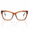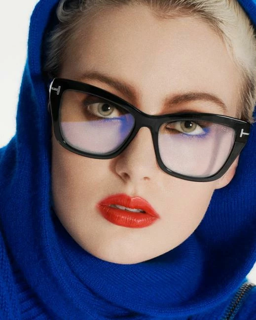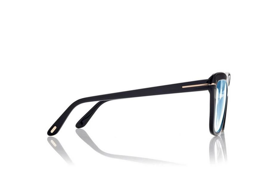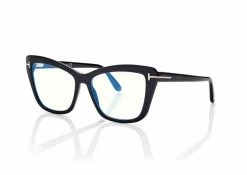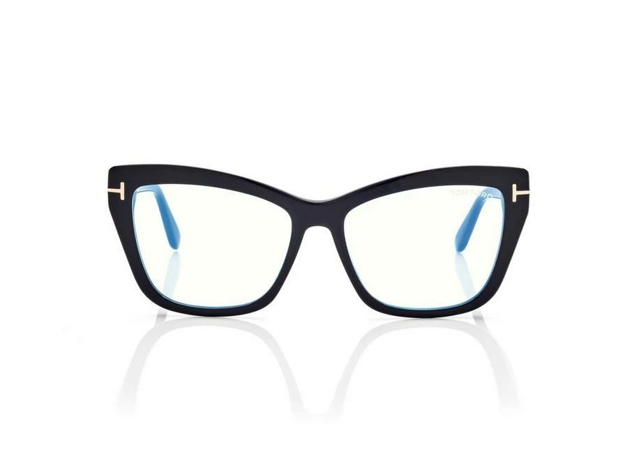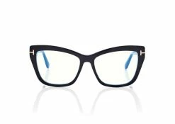 Discover the latest ready-to-wear clear lenses now available in TOM FORD Eyewear. These protective lenses reduce risks of blue lights and increase visual comfort from long exposure to digital devices. Feminine square cat eye style in acetate enriched by metal T logo decoration.