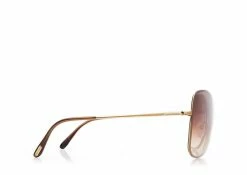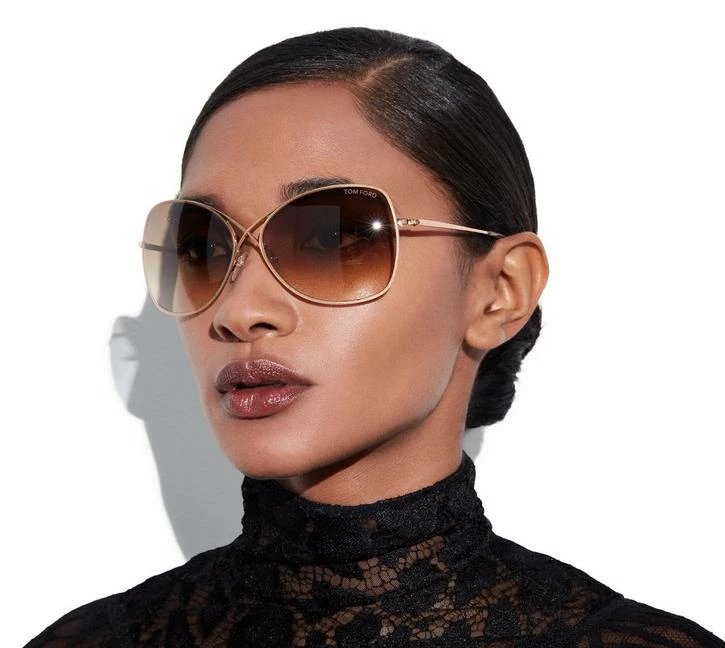 - Shiny rose gold metal frame with metal ‘T’ logo, transparent brown plastic temple tips and gradient brown lenses