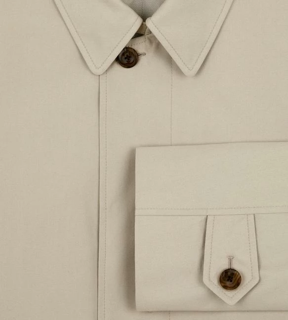 - HALF LOZENGE LEATHER DETAIL WITH HORN BUTTON FASTENING ALONG COLLAR