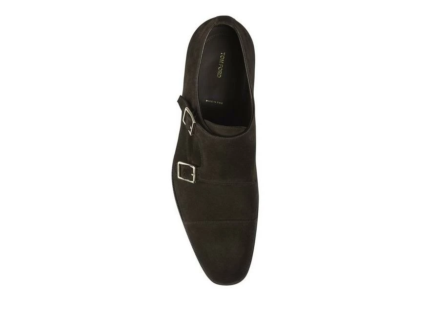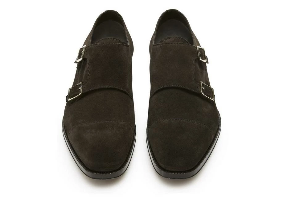 A TIMELESS CAP-TOE STYLE WITH DOUBLE-BUCKLE MONK STRAPS ACROSS THE VAMP. CONSTRUCTED OF FINE ITALIAN SUEDE AND POLISHED BRASS HARDWARE.
