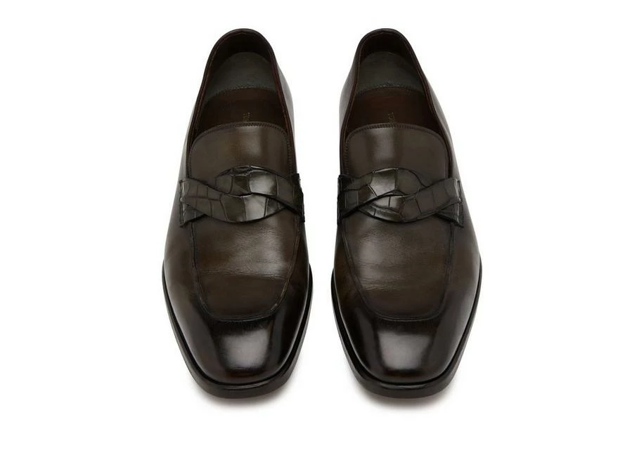 TIMELESS ADNEY TWISTED BAND LOAFERS CRAFTED OF BURNISHED LEATHER WITH AN ALLIGATOR FRONT TWISTED BAND.