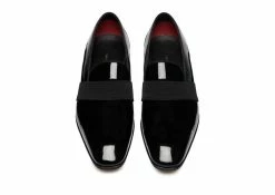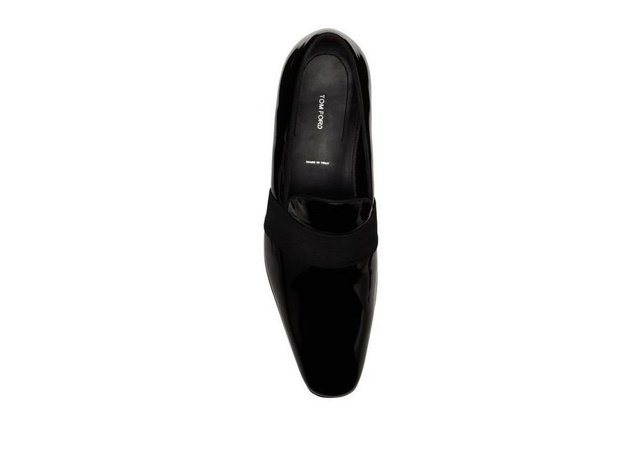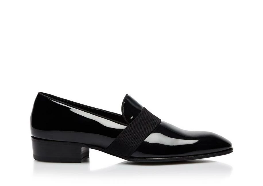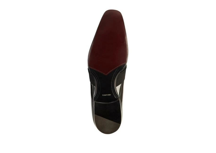 A timeless Tom Ford slip-on evening shoe crafted in Italy of black calf leather, patent leather, and kid leather. Features a 30mm heel.