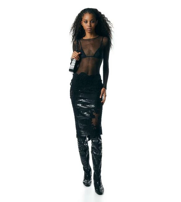 - CRAFTED IN MATTE SOFT GOAT LEATHER PRINTED WITH A UNIQUE CROCO PATTERN FINISHED WITH A SHINY EFFECT AND SEE-THROUGH INSERTS OF A LUXURIOUS FLORAL GUIPURE LACE