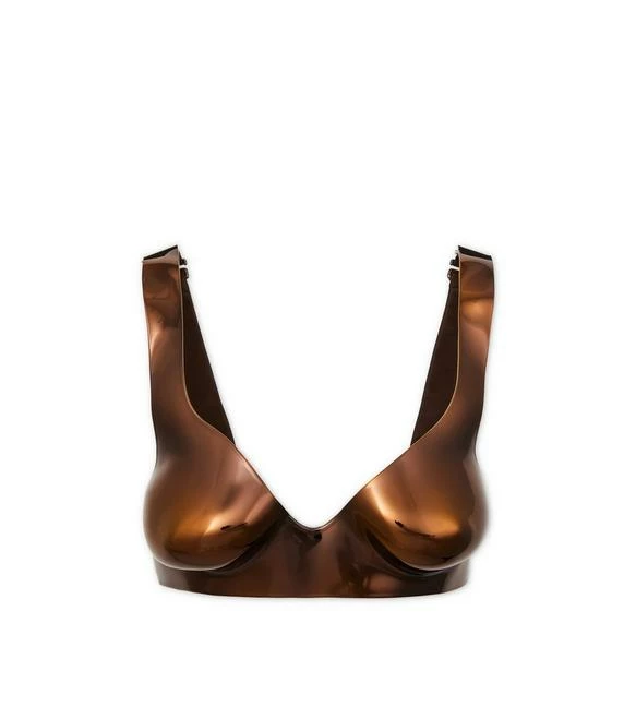 ACRYLIC OPEN BACK BRA WITH ADJUSTABLE SATIN STRAPS. CRAFTED IN LACQUERED CHROMED ACRYLIC AND FULLY LINED IN LEATHER.