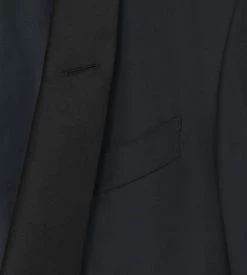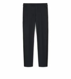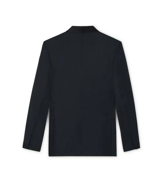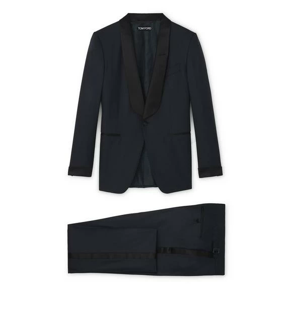 A SIGNATURE TOM FORD TUXEDO WITH AN O’CONNOR BASE. FEATURING CONTRASTING BLACK SATIN LAPELS, SINGLE BUTTON, GAUNTLET SLEEVES, AND SATIN TAPING ON THE TROUSERS.