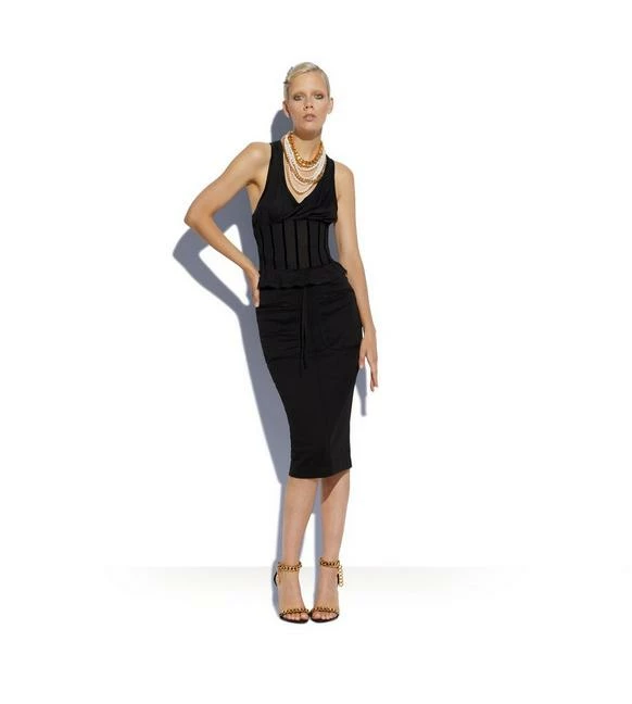 - PLEATED WAIST, CONSTRUCTED WITH BONES COVERED WITH TONAL VELVET TAPE FOR BLACK VERSION AD SATIN TAPE FOR CHALK VERSION
