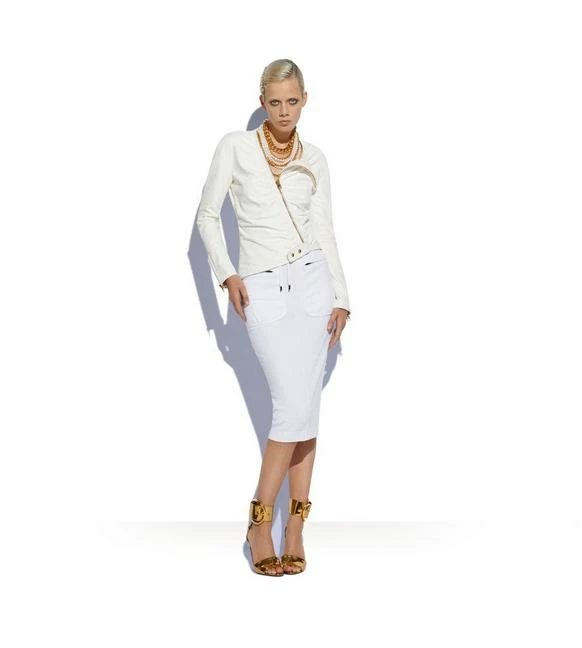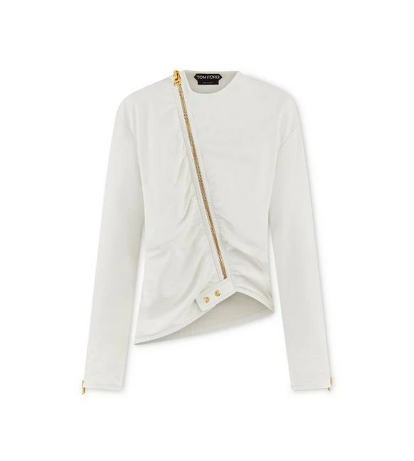 - SLANTED ICONIC ZIP FOR CLOSURE WITH RUCHED EFFECT