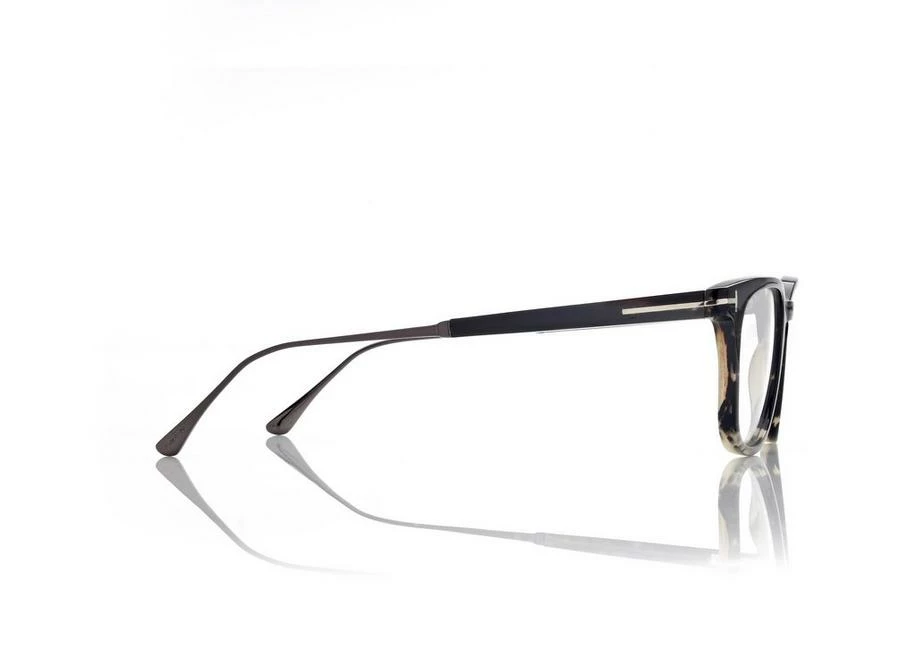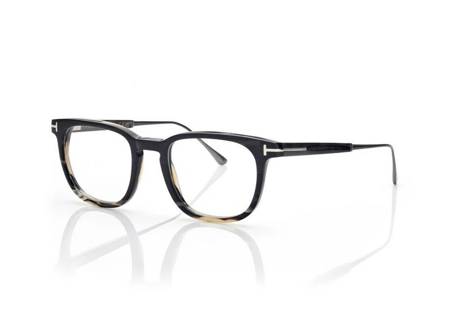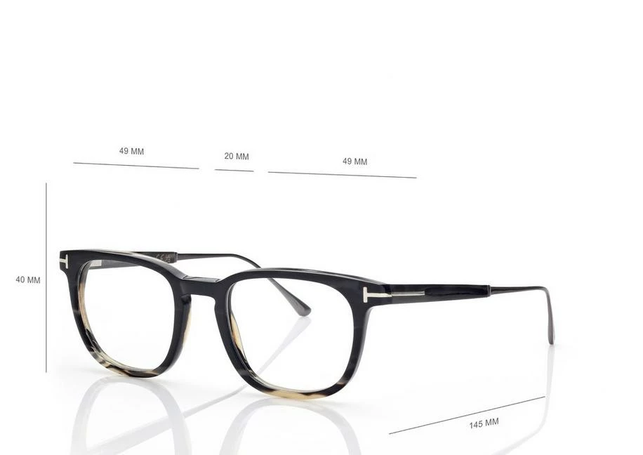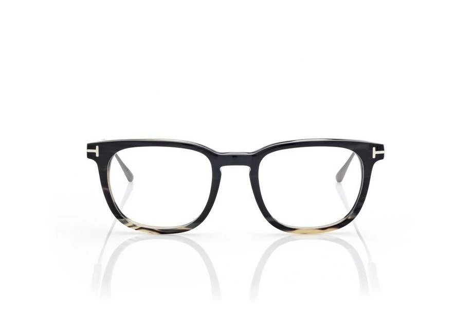 Elegant square frame with key bridge and sophisticated details. The style is characterized by horn front and combined temples between horn and lightweight titanium. Metal ‘T’ temple decoration.