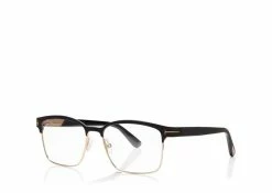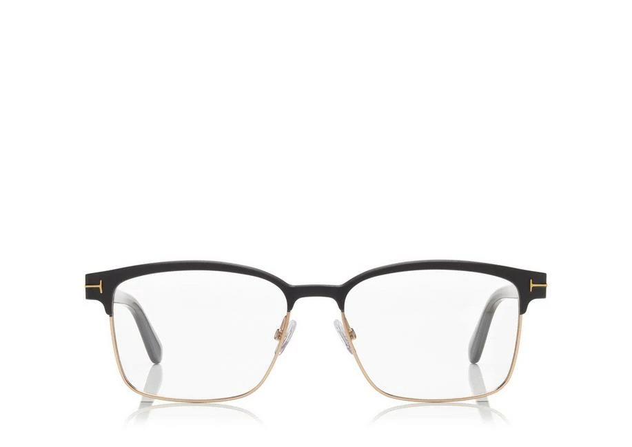 - Matte black outer top and rose gold inner side metal front and shiny black acetate temples with rose gold metal T logo.