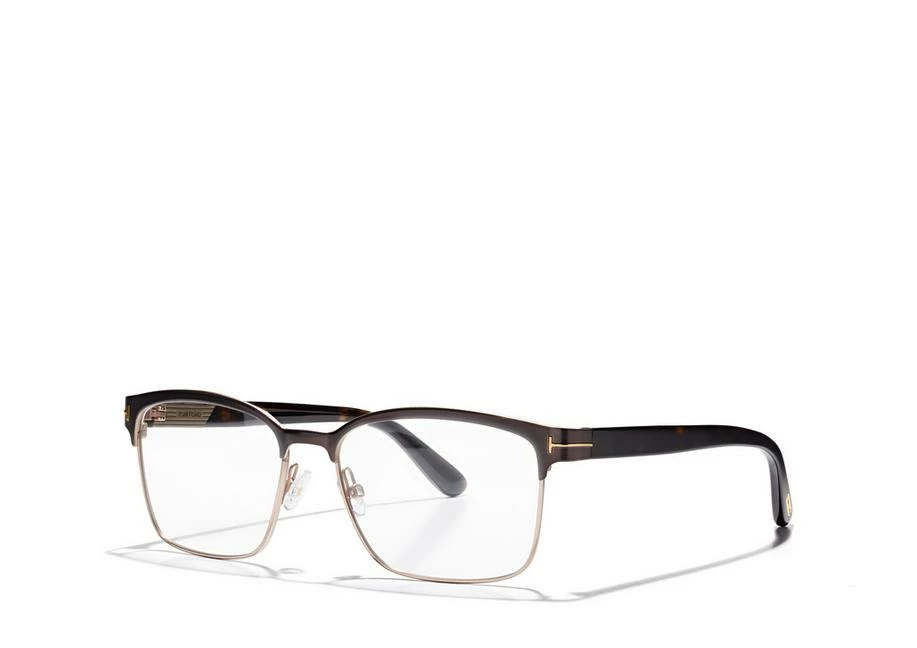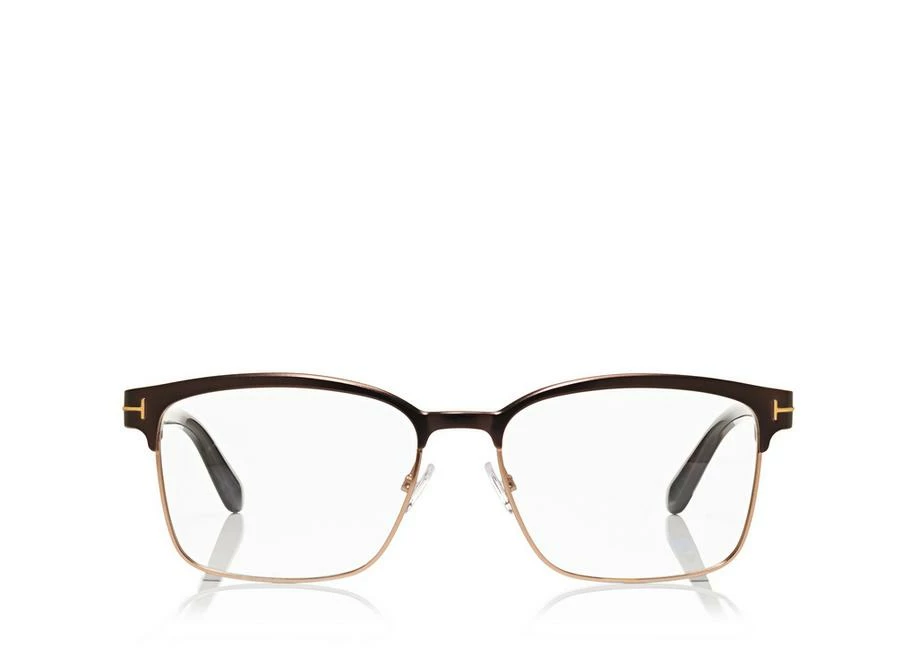 - Matte brown outer top and matte bronze inner side metal front and shiny classic havana acetate temples with matte rose gold metal T logo.
