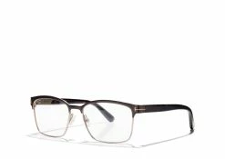- Shiny gunmetal metal front and shiny horn acetate temples with shiny gunmetal T logo.