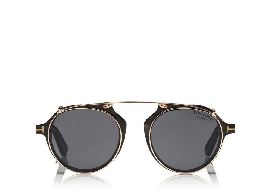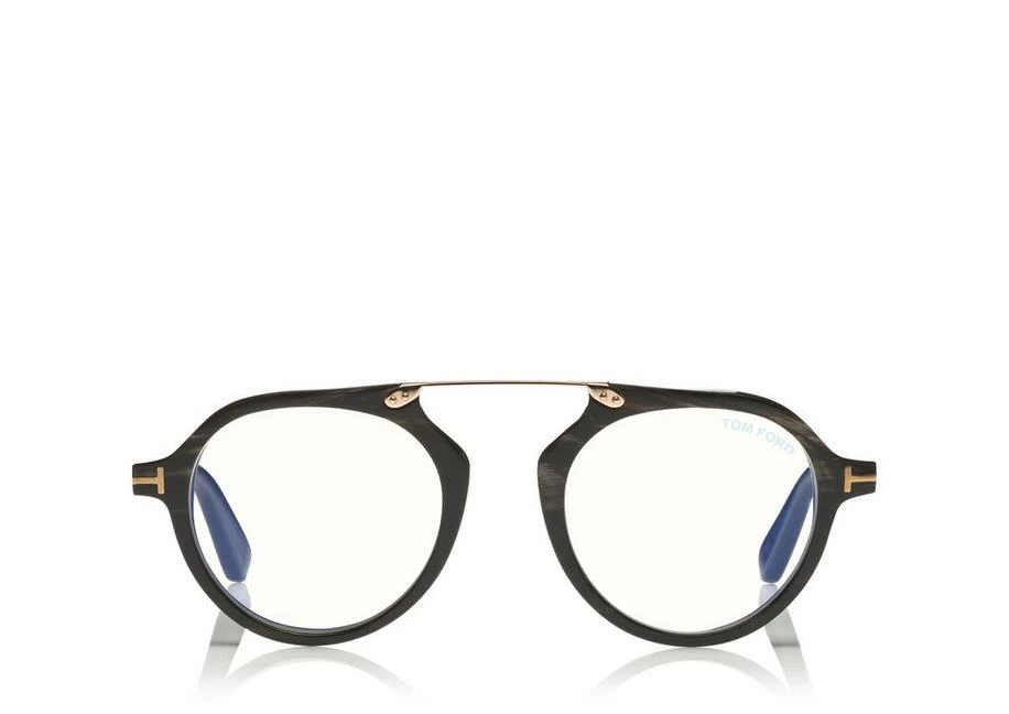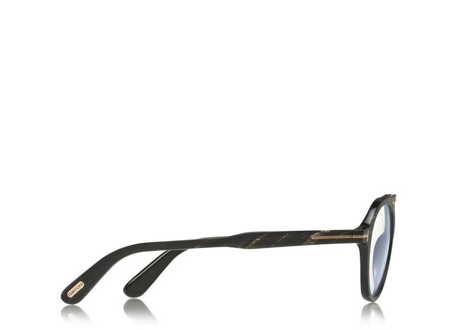 Discover the latest ready-to-wear clear lenses now available in TOM FORD Eyewear. These protective lenses reduce risks of blue lights and increase visual comfort from long exposure to digital devices. Soft pilot in real buffalo horn shape, with metal bridge. Real water buffalo horn is selected for its luxurious finish and natural pattern that gives each piece its unique quality. It is offered with polarized clip on.